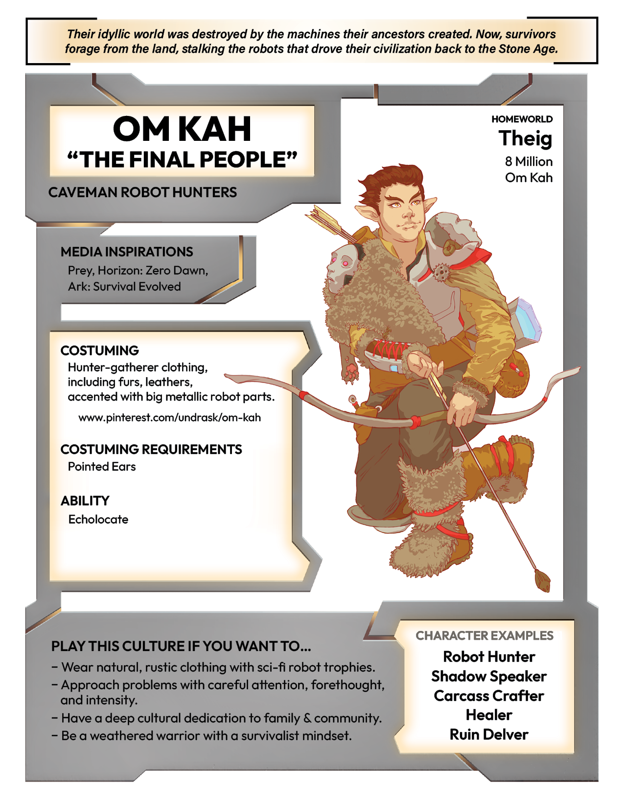 Om-Kah are more than the remnants of a long forgotten civilization. All across Theig, they have made new cultures, thriving on the abundance provided by the earth, their families, and the machines that once attempted to destroy them.